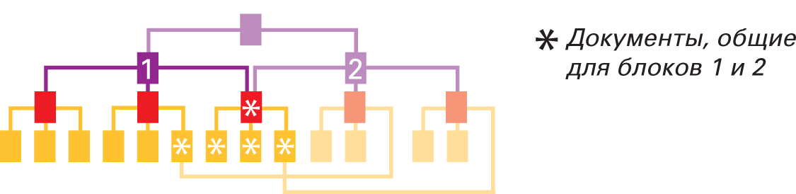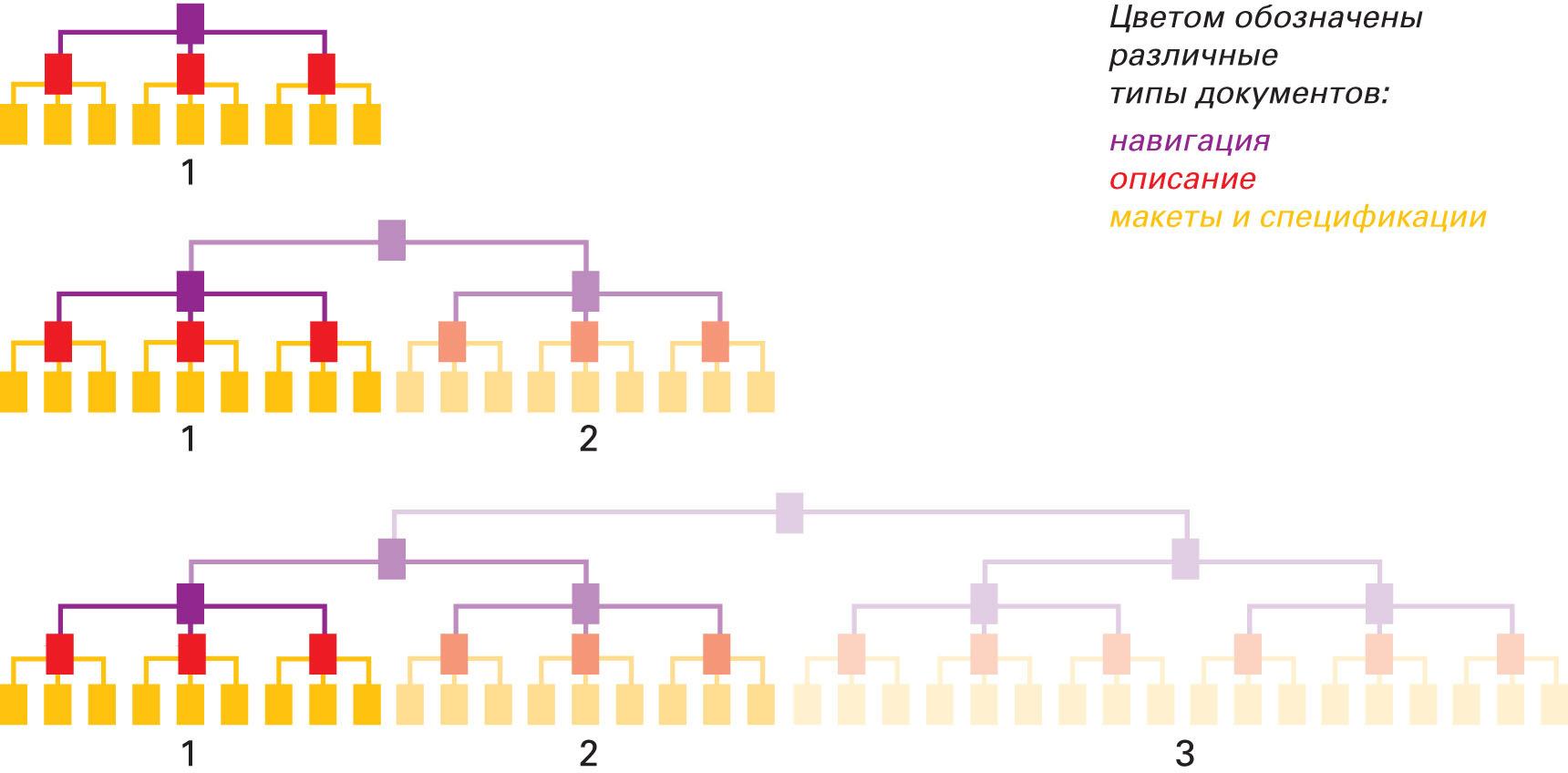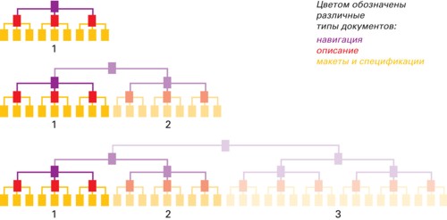 Если в предыдущем примере руководство «росло вверх» вслед за усложнением структуры, то в этом случае видно, как оно может углубляться в противоположном направлении без изменения существующей структуры. В частности, это может быть выражено в увеличении «прилинкованных» к описательной странице документов — оригинал-макетов, спецификаций и рекомендаций.