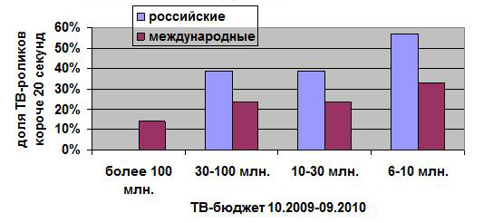 у международных рекламодателей косметических средств и средств гигиены доля бюджета, потраченного на короткие ролики составляет 21%, а у Концерна "Калина" 56%;