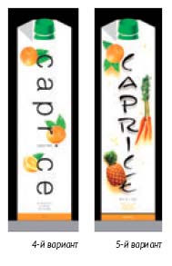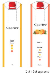 Дмитрий Мелихов, арт-директор дизайн-студии IKON: Сама концепция необычности продукта, удовлетворяющая самым изысканным и капризным покупателям, заставила нас искать нетрадиционные пути решения дизайна для новых премиальных соков и нектаров Caprice. Одним из самых первых вариантов была идея «золотого слитка», отображающая незыблемую ценность и достоинство продукта, хорошо вписывающаяся в высокоценовой сегмент. Но в силу не совсем «соковости» и «капризности» эта идея не смогла долго просуществовать.