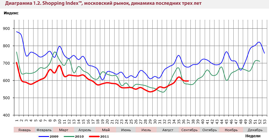 «Сглаженная» динамика Shopping Index продолжает сохраняться. Пик 35й недели был выражен гораздо слабее, чем аналогичные пики 2010 и 2009 годов. Однако и последовавший «отскок» был незначительным: в результате в последние две недели траектория Индекса-2011 выше показателей Индекса-2010.