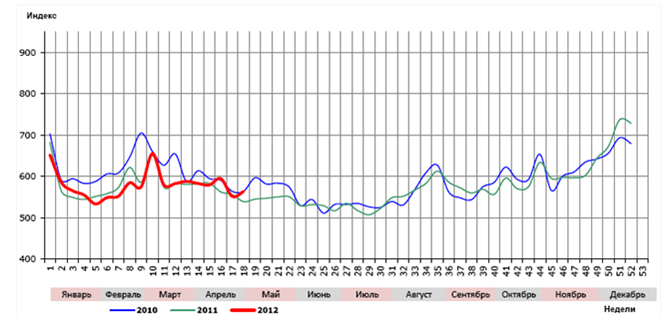 По словам президента компании Watcom Group Романа Скороходова, рост индекса на 18 неделе (первые майские праздники) после спада неделей ранее вполне объясним – на предпраздничной неделе было 6 рабочих дней, в результате многие крупные ТЦ, находящиеся в спальных районах и за МКАД 28 апреля недополучили посетителей. |