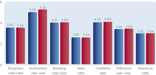 В общем случае мы не наблюдаем существенных различий в реакции мужчин и женщин на рекламу. По всем базовым параметрам, характеризующим бренд, сколько-нибудь существенных гендерных различий для англоязычной рекламы в США нет. В качестве таких параметров для оценки ТВ-рекламы использовались следующие факторы: удовольствие, вовлеченность, брендированность, новизна, степень доверия, выделение на фоне конкурентов и актуальность в оценке.