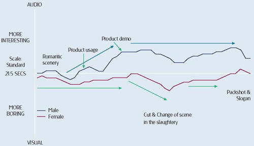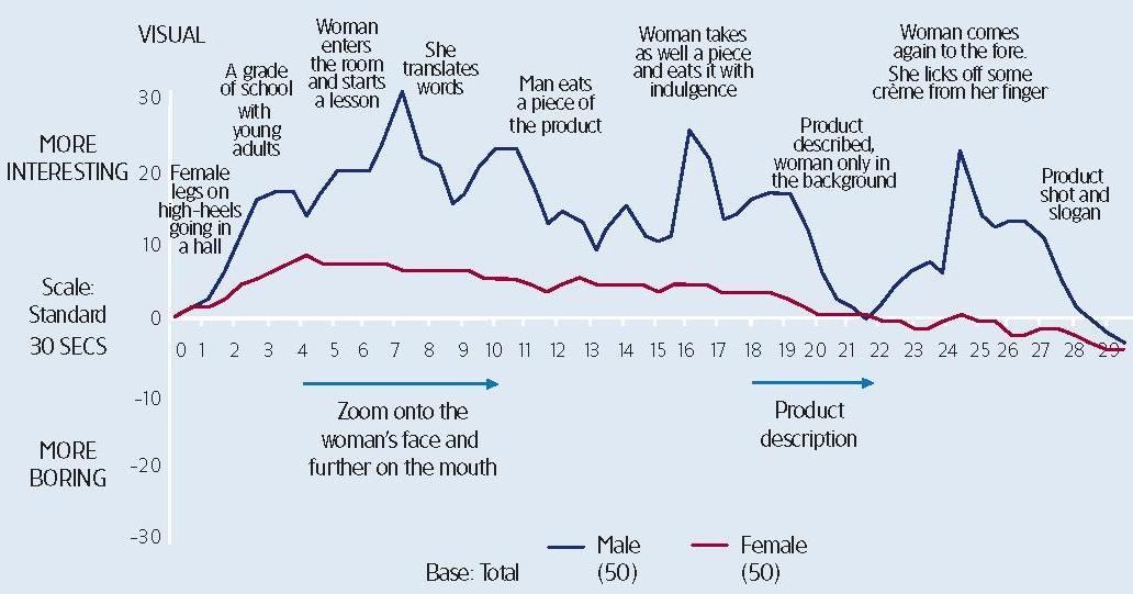 Реклама, в которой используются сексуальные образы, также может вызывать совершенно разные реакции гендерных групп. Некоторые ролики благосклонно воспринимаются представителями обоих полов, но по разным причинам. Например, в рекламе дезодоранта снята девушка, которая готовится к свиданию, в то время как ее молодой человек поднимается в лифте. Аудитория в целом хорошо приняла этот ролик, но мужчины и женщины отреагировали на разные элементы рекламы. Женщины следили за общим развитием сюжета, тогда как пик мужского интереса пришелся только на тот момент, когда женщина появилась на экране в нижнем белье.
