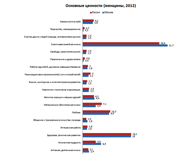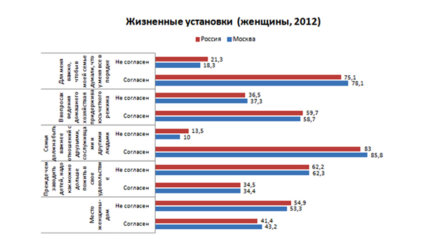 В России же ситуация прямо противоположная. Критерий социального успеха до сих пор измеряется понятием – замужем женщина или нет. Женщина может быть талантлива и успешна, достичь больших высот в профессиональной деятельности, но если у нее нет мужа и детей, то общество на нее смотрит с некоторым снисхождением и даже сочувствием: мол, «что-то с ней не так, если она до сих пор не замужем». Выйти замуж и родить ребенка – критерий самореализации для российской женщины. Именно поэтому большинство женщин в Москве и России в целом считают своей основной жизненной ценностью счастливую семейную жизнь и готовы отказаться ради нее от свободного времени, карьерного роста и даже общения с близкими друзьями и коллегами. Многие женщины из-за всех сил стараются совмещать роли идеальной жены, матери и хозяйки, чтобы заслужить похвалу близких, уважение друзей, а также иметь ощущение самореализации. Несмотря на то, что, по последним данным, 77,6 % женщин и 62,7 % мужчин, состоящих в браке, согласны с утверждением о равноправном разделении обязанностей в российской семье, на хрупких плечах женщины лежат основные домашние хлопоты, с которыми она должна справляться на «пятерку», по-другому быть не может.