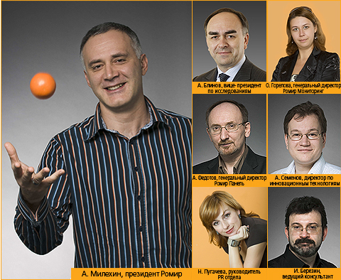 Оборот компании: О «Ромире»: «...Ключевые игроки рынка нуждаются в больших исследовательских структурах с разнообразными ресурсами, с возможностью развития инновационных технологий и синергетических продуктов. Именно поэтому Ромир Холдинг востребован и будет успешно работать еще долгие годы». (А. Милёхин) «Для того чтобы стать лидером на российском рынке необходимо демонстрировать уникальные преимущества, добывать инсайд, любую технологию адаптировать к местным условиям» («Компания», №12, 31 марта 2008 г.) «Если мы исследователи, то должны быть очень бережны к окружающей действительности и сохранять нейтралитет. В этом профессиональная качественная особенность. В противном случае не получится объективных оценок.» («Персона», №6, 2007 г.) 21.05.2008