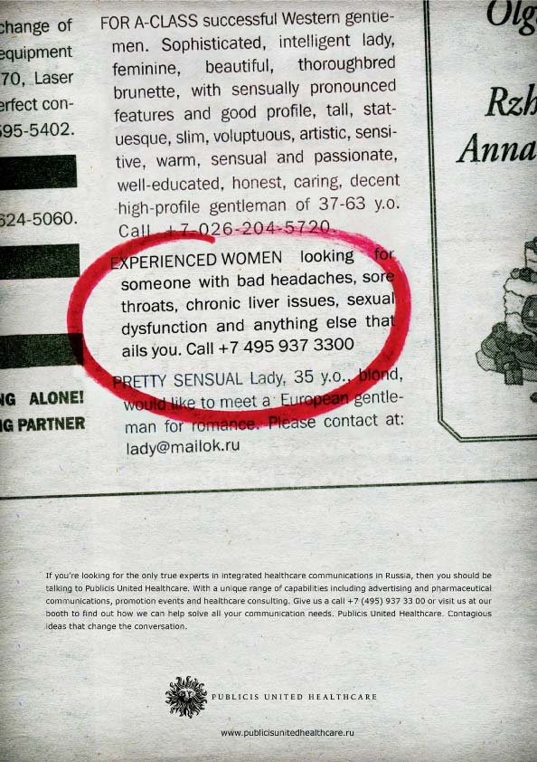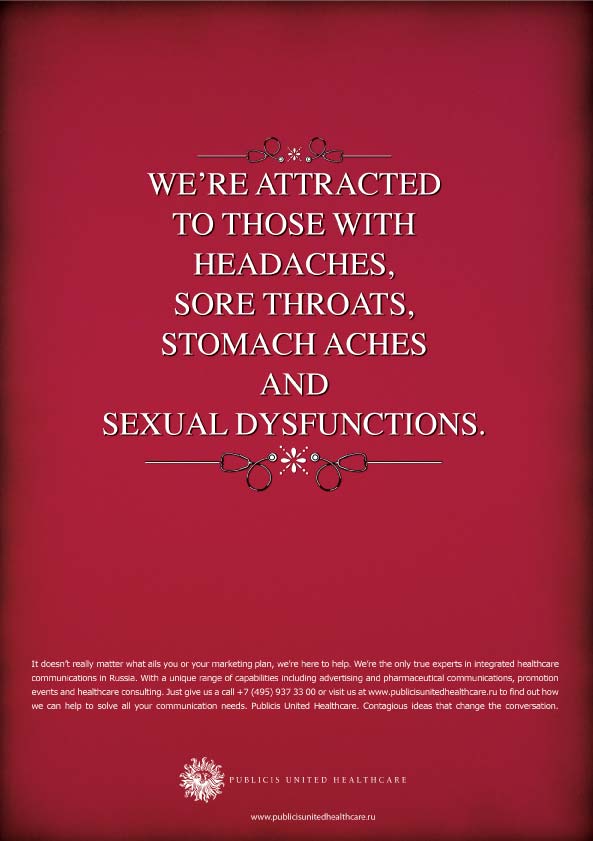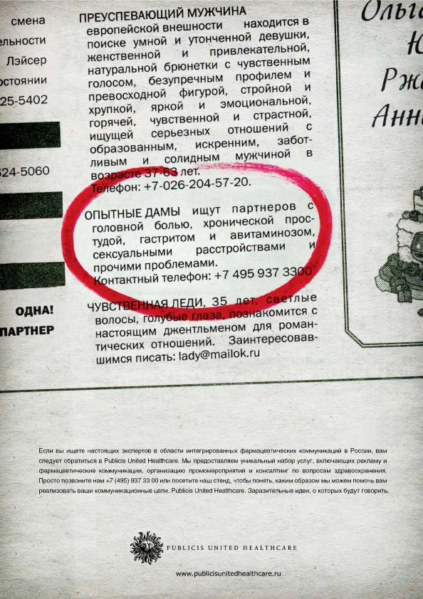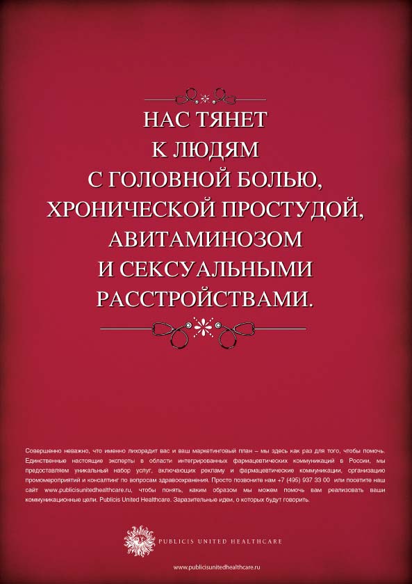 ![]() Визитка компании PUBLICIS UNITED HEALTHCAREАдрес: г. Москва, ул. Ленинградский Проспект, дом 15, стр. 1., недорогой пентхаус с видом на дорогостоящую недвижимость в центре города. Спросить, как пройти к доктору, щвейцар проводит. С собой иметь сменную обувь, одноразовые резиновые перчатки и кружку Эсмарха. Представительство в Интернете: www.publicisunitedhealthcare.ru О нас: В России Publicis United Healthcare входит в группу креативных агентств Publicis United и специализируется на коммуникационных услугах в индустрии фармацевтики и медицины, здравоохранения и здорового образа жизни. Главная особенность нашего отдела состоит в универсальности квалификаций сотрудников клиентской службы. Нет, разумеется, аккаунты не работают в иллюстраторе (хотя почему бы и нет?). Но в связи с исторически нишевым позиционированием мы долго не могли себе позволить привлечения к проектам нескольких специалистов: стратег отдельно, аккаунт отдельно, медиапланер сам по себе. В работе с фармой аккаунт - это универсальный солдат, который способен и обязан ответить на максимум вопросов клиента в течение встречи без фраз типа "я передам ваш вопрос в стратегический отдел". Это требует от людей постоянного совершенствования набора профессиональных знаний, широкого кругозора и открытости. Благодаря подобной установке мы можем многое: - стратегия для продвижения рецептурных и безрецептурных препаратов; - работа с аптеками, врачами и конечными потребителями как звеньями одной цепи - много хорошего и разного креатива; - любые мероприятия и акции по стимулированию продаж; - грандиозные лончи брендов "под ключ"; - мониторинг успешности работы средствами исследований и аналитики; - производство любой продукции под грифом "промоматериалы для специалистов широкого врачебного профиля". Наше кредо: Заразительные идеи, о которых будут говорить! Наша миссия: И вас вылечим. Что касается философии работы с продуктами и брендами, то все довольно просто. Мы должны любить продукт или услугу, которую мы помогаем продвигать. Если продукт релевантен по показаниям ЦА наших сотрудников, мы им пользуемся и рекомендуем друзьям и знакомым. И никогда не возьмемся за продвижения бренда, который вызывает сомнения относительно качества или этических принципов компании-производителя. Несмотря на бюджет. Это мы вам как врачи говорим. Корпоративный цвет: У нашего отдела есть корпоративный цвет, который нашел отражение в гардеробе сотрудников. Этот цвет - серый. Он еще и отлично сочетается с корпоративным цветом Publicis - красным. История компании: Как самостоятельная бизнес-единица отдел Publicis United Healthcare функционирует с 2007 года, когда еще фармбизнес считался нишевым. На базе многолетней работы с большим сетевым клиентом накопилась довольно серьезная профессиональная экспертиза. Принимая во внимание особенности так называемой "медицинской рекламы" и "фармклиента", стало очевидным, что для развития подобного бизнеса необходимо создание спецподразделения. Так появился бизнес-отдел (business unit) по работе с фармрынком. В группе Publicis к нашему отделу всегда относились с трепетом. Это было основано на священном ужасе, который пациент испытывает перед врачом. Ввиду факта, что руководитель отдела (в прошлом аккаунт-директор на фармклиенте) имеет медицинское образование, на общий статус выдвигались вот такие брифы: Бренд: неизвестен, в фа