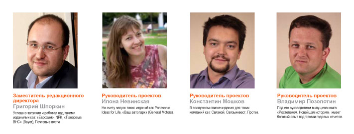 Руководитель проектов - Илона Невинская. На счету запуск таких изданий как Panasonic Ideas for Life, "Ваш автопарк" (General Motors).