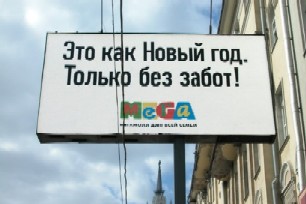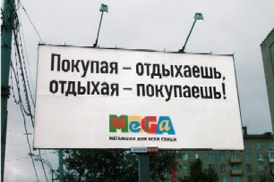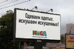 - У нас был совершенно чудовищный бриф. Кстати, ты обязательно укажи, что это не мы вели клиента, с "Мега" работает агентство McDonnell Wielaard, которое нас и пригласило. Заказчики хотели всего и сразу. Надо было указать, что там много магазинов, много развлечений, обязательно про какие-то семейные дела. Короче, целая страница чего бы они хотели. Но самое печальное - эта кампания должна была вывести марку на рынок. А этих "Мег" - <…> туча. Во-вторых, безумно плохой логотип! Он не выдерживает никакого соседства, только большое белое поле. И я сказал: ребята, здесь невозможно сделать никакой картинки, потому что под крышей одного мегамолла существует 220 магазинов разного профиля - от "Спортмастера" до Zara. И повторять "Крокус" - "Коллекция модных марок" - не имело смысла. Мы стали искать эмоциональную составляющую. Подергались, подергались. А кампанию, как всегда, за два дня делали. И я говорю: только белый фон и черные буквы. Альтернативы не вижу.