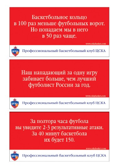 - Меня очень выручает фотоаппарат. Есть такое определение: камера - это инструмент, который учит смотреть на мир без камеры. Очень полезная вещь! Развивается фантастическая зрительная память. Тарантино, когда работал в видеопрокате, смотрел фильмы по 14 часов в сутки. У меня же бывают периоды, когда я смотрю по 5-6 тысяч картинок в день. Очень помогают альбомы фестивальной рекламы: не с целью украсть, а натолкнуться на идею. Очень хорошая вещь - мозговой штурм, когда все собираются и начинают откровенно бредить. Интересные ходы открываются... И смена обстановки, конечно... Идея рекламы баскетбольного клуба ЦСКА пришла ко мне во время просмотра какой-то телепередачи про выставку цветов в Голландии. Брали интервью у одной цветочной поставщицы из Эквадора, и ее спросили: "Кого вы считаете своими конкурентами?" И по интонации было понятно, что журналист ждет, как она ответит: "Голландцы - мои враги. И израильтяне с их розами". А она говорит: "Мои главные конкуренты - производители духов и шоколада!". Вот из этой фразы была придумана идея войны с футболом, за его болельщиков.