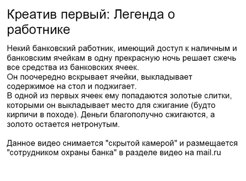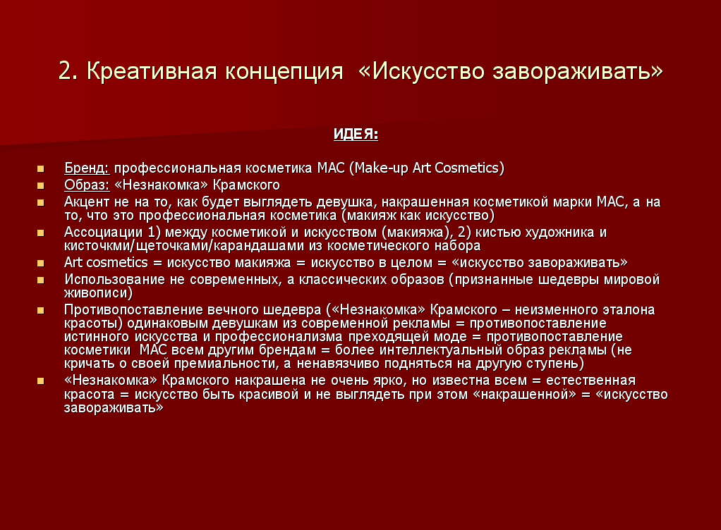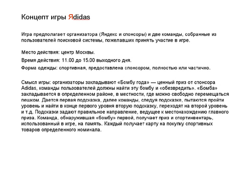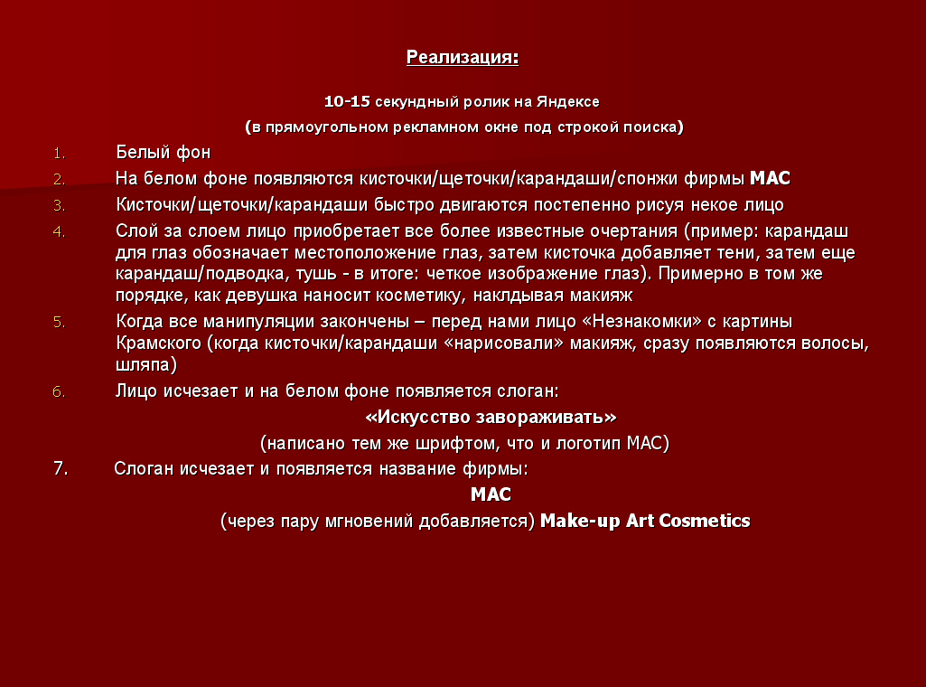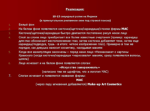 Wordshop Digital изнутри. Работы студентовКак я уже говорил, на курсе Wordshop Digital учится довольно много людей из различных агентств. Хоть курс digital-рекламы и им в новинку, но все-таки эти ребята уже "плотно сидят" в рекламе. Однако среди примерно 70 слушателей имеется и десяток тех, кто попал на обучение, пройдя конкурсный отбор. Думаю, всем было бы интересно увидеть, какие именно идеи помогли им пробиться на WordshopВ качестве вступительного задания абитуриентам предлагалось разработать спецпроект по рекламной категории для определенного портала. И тот, и другой показатель - выбирались рандомно. Среди рекламной категории абитуриент вправе выбрать любой бренд. Кураторы курса Василий Лебедев из Red Keds и Дарлан Мораэс мл. из Proximity Russia поделились своим подходом к оценке работ "абитуриентов" - в общем итоге было прислано около 40 заявок. Дарлан так прокомментировал выбор работ: "Для меня существовало два главных критерия, по которым я рассматривал конкурсные задания: креатив и простота. Никто не ждет от студентов слишком многого. Работа может быть какой угодно безумной, она может не укладываться в бриф, может быть сделана на коленке, но если там есть идея, есть out of the box thinking, я возьму этого студента. Потому что у него голова устроена так, как нужно, кровь кипит, огонь горит в глазах. Это правильные люди, в них много энергии, много энтузиазма". Но это не единственное, что могло заинтересовать креативного содиректора Proximity Russia. Он отметил, что если креативная идея так себе, то второй критерий - простота. "Принцип KISS - Keep It Stupid Simple. Очень понятная идея, простая реализация. Конечно, простота без креатива - это хуже, чем наоборот. Но все равно, я буду иметь эту кандидатуру в виду. Но, если отсутствует и то, и другое, то - увы. Значит, надо еще поучиться, еще попробовать". В свою очередь Василий Лебедев высказался обо всех присланных проектах в том ключе, что очень многие студенты зацикливаются на просчете эффективности, составления процентного соотношения целевой аудитории и прочем. "Хорошо, что мы обращены лицом к стратегии и медиа. Осталось повернуться лицом к креативу. Даже во вред миллионам цифр, обоснованиям и другим статистическим штукам. Больше авантюры в глазах! - призывает он. Ниже представлены самые интересные, по мнению кураторов, работы из числа тех, что привели их креаторов на учебные места Wordshop Digital Ольга Миронова, видео для Mac на Яндекс.ру "В этой истории для Mac очень грамотно описана проблема - однообразие рекламы декоративной косметики. И дальше четко сформулированы цели, выбран нестандартный подход и реализация, - отмечает Дарлан. - Мне очень понравилась идея с предметами косметики Mac, которые становятся инструментами художника, рисующего шедевр". Александр Тишковский, Mia на Одноклассниках.ру Суть проекта - вовлечение ЦА в процесс коммуникации. Цель проекта - укрепление имиджа и повышение узнаваемости бренда. Партизанско-вирусная реализация не вызовет отторжения у людей, как могла бы это сделать прямая реклама. Мероприятие проводится от лица команды odnoklassniki.ru. В открытую бренд mia не упоминается. Flash вставки появляются единожды при первом логине пользователя с момента начала акции. Через 24 часа с момента начала акции на обоих типах аккаунтов под главной фотографией пользователя размещается кнопка: у девушек - "ангельский счетчик"; у мужчин - "количество ангело