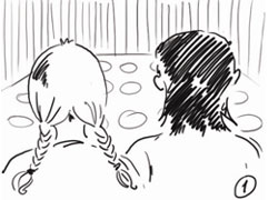 Камера показывает два затылка. Один женский - с длинными светлыми волосами, второй мужской с темными короткими.