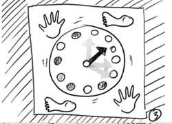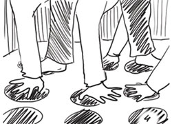 Камера показывает только руки и ноги, принадлежащие мужчине и женщине, которые занимают кружочки на поле для игры.
