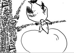 Камера наезжает на ворону, которая клюет яблоко, выклевывая в нем дырку.