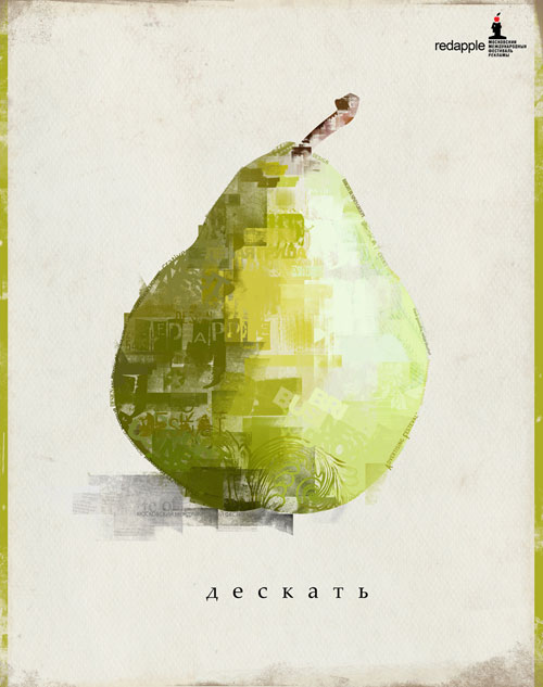 Визуализация идеи образа фестиваля должна обыгрывать основные посылы: фестиваль международный, мероприятие - интересное и достойно внимания, символ яблока не должен быть упущен, но не "давить" на сознание. Учитывая вышеизложенные аспекты: Видео-ролик. В кадре крупным планом лицо мужчины-европейца. Он подносит ко рту яблоко и кусает с характерным звуком (похожим на звук шага в сугроб мерзлого снега). Камера движется слева - направо в кадре появляется чернокожая женщина, которая тоже кусает яблоко с характерным звуком (другого тона). Камера движется дальше - в кадре - мужчина-монголоид быстро два раза кусает яблоко. Далее камера движется в том же направлении, но быстрее - в кадре люди различных национальностей кусают яблоки. Очередность звуков различной тональности "кусания" яблок складывается в мелодию "Эх, яблочко". На этот звук накладывается настоящая мелодия известной песни. Камера быстро отъезжает назад - становится понятно, что люди стоят большой толпой и едят яблоки. Камера отъезжает дальше, видно что люди стоят на "северном полюсе" планеты, на которой океаны и материки - как на Земле, но "Земля" имеет форму яблока с черенком, растущим из "южного полюса". Люди оказываются "верхом" перевернутого яблока-планеты (см. изображение 1). Камера отъезжает настолько, чтобы вся планета вместилась на экране. Планета медленно вращается. Мелодия "Эх, яблочко" продолжает звучать. Первый голос за кадром: Московский международный фестиваль рекламы Redapple. Второй голос: Стоим на... (сказано неразрывно, на манер маргинального "стоимнах") Первый голос, перебивая второй: своем. Таким образом складывается фраза-слоган: "Стоим на своем!". Радио-ролик. Звук "откусывания яблока", короткая пауза, второй звук другого тона, двойной звук "кусания" яблока (другого тона) и т.д. Данные звуки складываются в мелодию "Эх, яблочко". На эту мелодию накладывается настоящая мелодия "Эх, яблочко". Первый голос: Московский международный фестиваль рекламы Redapple. Второй голос: Стоим на... (сказано неразрывно, на манер маргинального "стоимнах") Первый голос, перебивая второй: своем. Таким образом складывается фраза - слоган: "Стоим на своем!". Концепция 2. Показать незаурядность, нестандартный, смелый подход к рекламным решениям, как особенности ФЕСТИВАЛЯ РЕКЛАМЫ можно посредством альтернативного позиционирования самого фестиваля. Визуализацией концепта образа Московского международного фестиваля рекламы Redapple является оригинальный рисунок на белом фоне: ЗЕЛЕНОЙ ГРУШИ и слогана: "Дескать:". В комплексе фраза: "Московский международный фестиваль рекламы Redapple" и визуального восприятия "Зеленой груши" со слоганом "Дескать:" - создает логичсекую цепочку в сознании - фестиваль рекламы "красное яблоко", представлен как "зеленая груша" - "Дескать". Т.е. Зеленая груша, дескать, - символ фестиваля РЕКЛАМЫ "Красное яблоко" - это ни что иное, как идентификация посредством противопоставления концептуальных образов. Видео-ролик (ver. 1). На светлом фоне на горизонтальной плоскости (в правой части кадра) лежит зеленая груша. Плоскость наклоняется, что заставляет грушу катиться в левую часть кадра. Груша катиться с характерным звуком (груша катиться по столу). Когда груша оказывается вне кадра, из правой части кадра "съезжает" по этой наклонной плоскости слово "ДЕСКАТЬ". Пэк-шот: Московский международный фестив