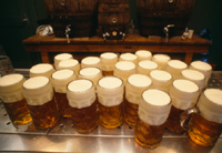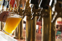 Бармен разливает пиво по кружкам