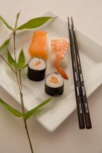 Стол кафе, на нем пицца и суши.
