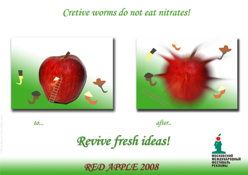 Игорь Борисов, Новосибирск - Конкурсная работа для Red Apple![]() Здравствуйте! Яблоки просили не рисовать, но я почему-то именно их и взял за "смысловое ядро", а иначе, зачем давать фесту название "про яблоки" и тут же: забыть про яблоки, где логика??? : В моей интерпретации яблоко это и есть собственно фестиваль, а черви - это криейторы из разных стран, принадлежность которых к стране стилизовано показана национальной одеждой, элементами головного убора, возможно, при более тщательной отрисовке - будет отражена расовая принадлежность в лицах. ТВ: (очень динамичная съемка по 1-2 сек план.) Общий план сада, птички поют, листочки шумят. Средний план - наезд на большое яблоко, висящее на ветке. Крупный план переходящий в макросъемку и показывающий жизнь насекомых. В яблоке дырка уже проеденная червями. Вокруг бегают черви в национальной одежде - папахи, шляпы, кепки и т.д. Пытаются попасть в яблко, приставляют лесницу, лезут. Текст: Креативные черви не едят консервы! Все попали внутрь, никого нет вокруг яблока, некоторое время тишина Потом раздаются аплодисменты, крики браво и и т.д. Через секунду яблоко начинает подрагивать, как бы испытвая нарастающее внутренне напряжение. Еще через 2 секунды достигает критической точки и взрывается в клочья, вместе с клочьями летят и черви в разные стороны мира, зарядившись свежими идеями! (возможно, в полете камера тоже словит парочку червей, с характерными криками, с национальным колоритом ) Пэк-шот: "Зарядись свежими идеями!" Московский Международный Фетиваль Рекламы "Red Apple 2008" Принт: См. пример, типичный вариант "до" и "после". Радио: Звуковой ряд из ТВ-ролика + добавится национальный колорит в "вынужденных визуальных паузах", То есть - "иностранная речь", причмокивание во время еды и т.д. Web - сайт: Все тоже - во флеше. С уважением Игорь Борисов Новосибирск 2008 |