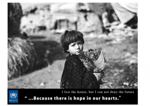 I lost hte house, but I can not deny the future. ''...Because there is a hope in our hearts.'' В создании плаката принимали участие два студента Shennan Liu и Jiang Tianhui.