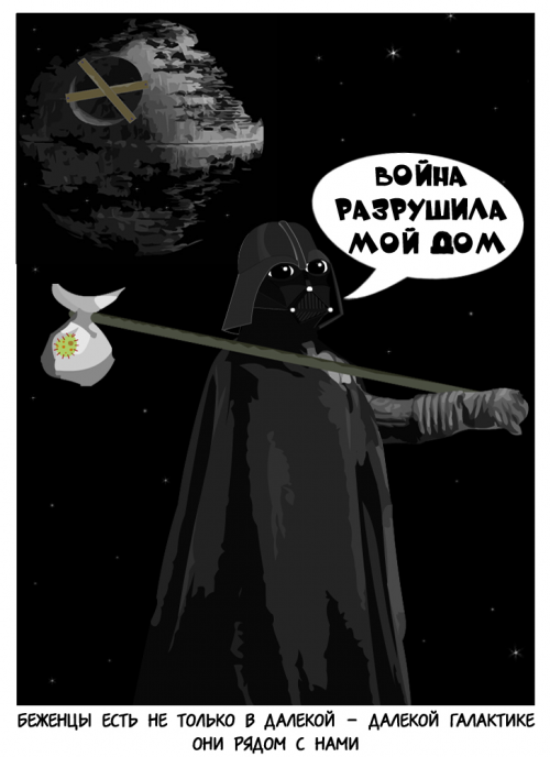 Основной задачей данного плаката было привлечение внимания к проблемам беженцев. Для этого я привлек широко известный и повсеместно растиражированный образ темного джедая из эпопеи Лукаса "Звездные Войны". Эффект воздействия достигается за счет помещения грозного Дарта Вейдера в непредставимую для него ситуацию, "звездные войны" разрушили его дом (звезда смерти - используется аналогичный прием) и он вынужден скитаться по галактике. Сопровождающий текст должен пояснить, что несмотря на комичность ситуации, проблемы беженцев существуют не где-то далеко - далеко (в далекой далекой галактике), а рядом с нами и остро нуждаются в решении.