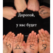 Сжатые кулачки. Колец (намёк на обручальные) не видно. Ниже - развёрнутые ладони, на которых теперь уже видны кольца. Буквы на руках формируют слово идея.