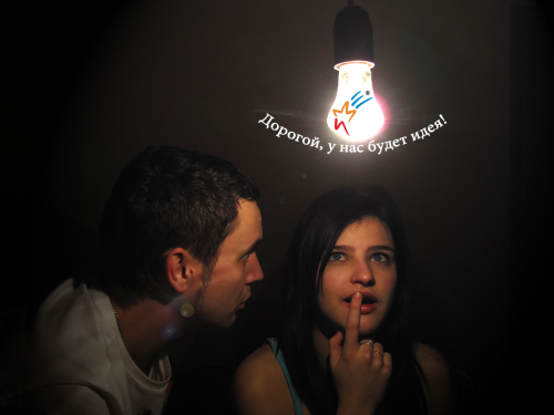 Лампочка - банально. Но её глаза горят, как эта "груша",которую нельзя скушать. И сразу кажется,что её действительно осенило... И что у неё реально мощнейший мыслительный процесс в голове... Рождение идеи...