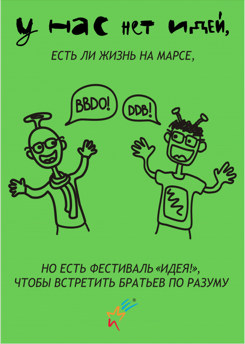 Фестиваль "Идея!" - отличный повод встретиться со своими единомышленниками, коллегами, друзьями из других агентств, познакомиться с кучей крутых рекламистов, обменяться визитками, поделиться опытом, вдохновиться идеями... В общем, войти в контакт с братьями по разуму!