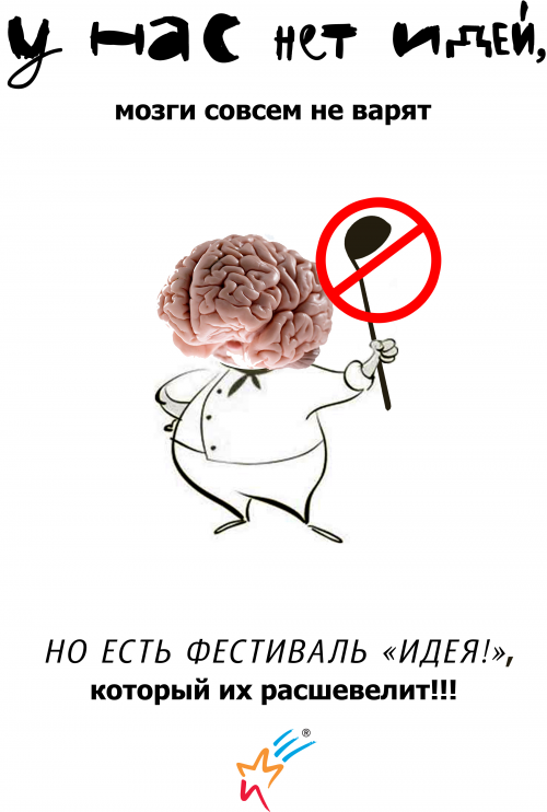 На плакате изображен мозг с поварешкой, который отказывается "варить", придумывать гениальные идеи, но фестиваль "Идея" его расшевелит.