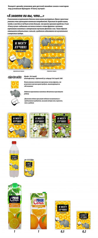 Участникам нужно предоставить концепт-дизайны для детской линейки соков и нектаров под условным брендом «Я могу лучше!» хотя бы для трех разных вкусов.