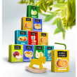 Cubes The concept of the package follows the principle of bright kids' cubes, simple in execution and design. To make it still more interesting and educative, a letter or a figure can be placed on the package. On the sides of the package informative data regarding the fruit this juice is made from can be placed.