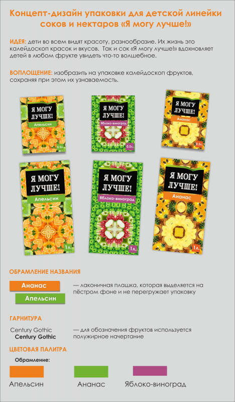 Участникам нужно предоставить концепт-дизайны для детской линейки соков и нектаров под условным брендом «Я могу лучше!» хотя бы для трех разных вкусов.