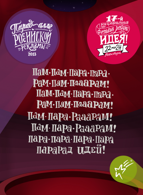 Национальный фестиваль рекламы «Идея!» совместно с информационно-аналитическим порталом Sostav.ru объявляет Конкурс на дополнительное место в жюри фестиваля. С помощью выложенного ниже шаблона, участникам предстоит создать рекламный плакат в фирменном стиле «Идея! 2013». Результаты конкурса на дополнительное место в жюри фестиваля «Идея!» будут объявлены 22 апреля!