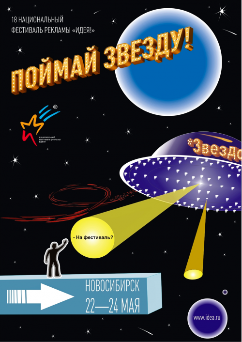 Звездолёт. Плакат сообщает, что собирает самых супермегазвёздных креаторов на планете «Идея!». Чтобы «приземлиться на её грандиозном фестивале не только вовремя и точно, но и по- космически креативно-круто, нужно поймать звезду. То есть… межпланетный «Звездолёт». На космическом сленге- просто звезду.