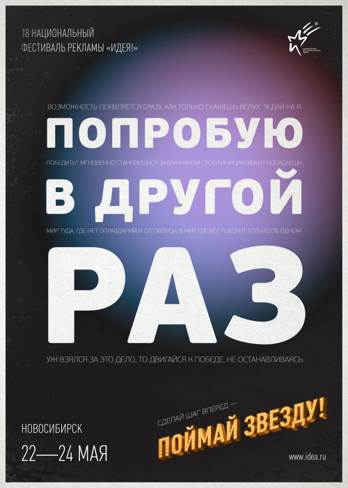 Серия постеров, в основе которых лежат отговорки и оправдания креативщиков. Постеры заставляют сделать шаг вперед, подойти к ним ближе, чтобы рассмотреть содержимое, тем самым приближая зрителя к заветной звезде. Те, кто не поленятся подойти, увидят, что это вовсе и не отговорки. Приложенные усилия для первого шага уже оправдали себя, необходимо двигаться дальше.