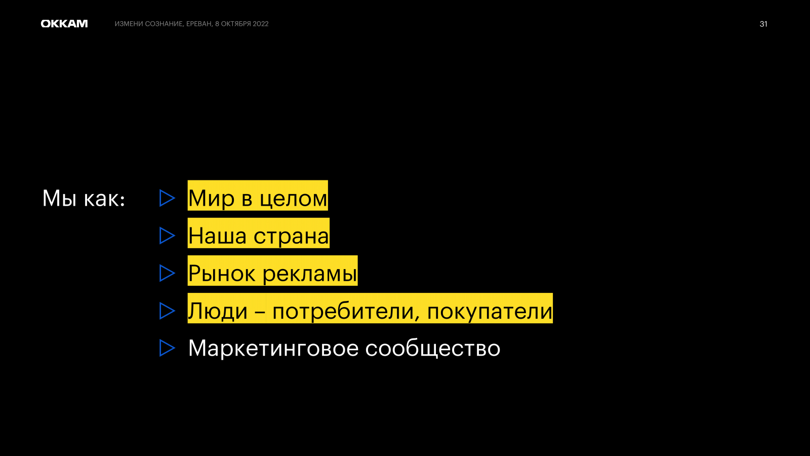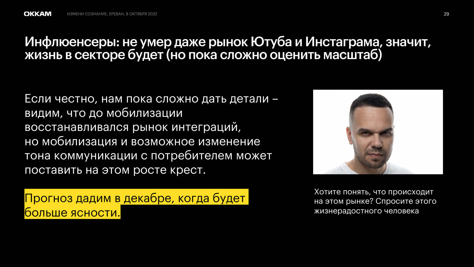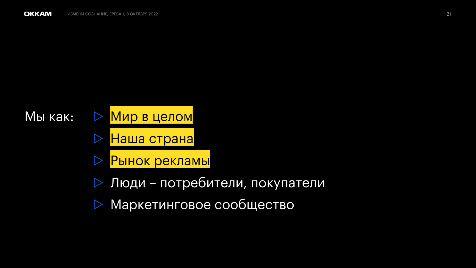 С 8 по 9 октября в Ереване прошла крупнейшая в России выездная конференция в области диджитал-маркетинга, которая ежегодно собирает вместе ключевых представителей рынка со стороны агентств, площадок и рекламодателей. Sostav традиционно делится презентациями делегатов.