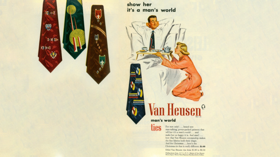 Еще один пример использования гендерного языка в рекламе эта старая реклама Van Heusen. Фраза «Покажи ей, что это мужской мир» обращается напрямую к мужчинам, в то время как женщины представлены лишь как посторонние наблюдатели, обещая, что продаваемые галстуки «сделают ее такой счастливой от этого». Такое использование языка в этой рекламе представляет власть и контроль как нечто естественно мужское. Эта реклама не просто отражает гендерные роли, она также указывает людям, как себя вести, призывая мужчин быть доминирующими и контролирующими.