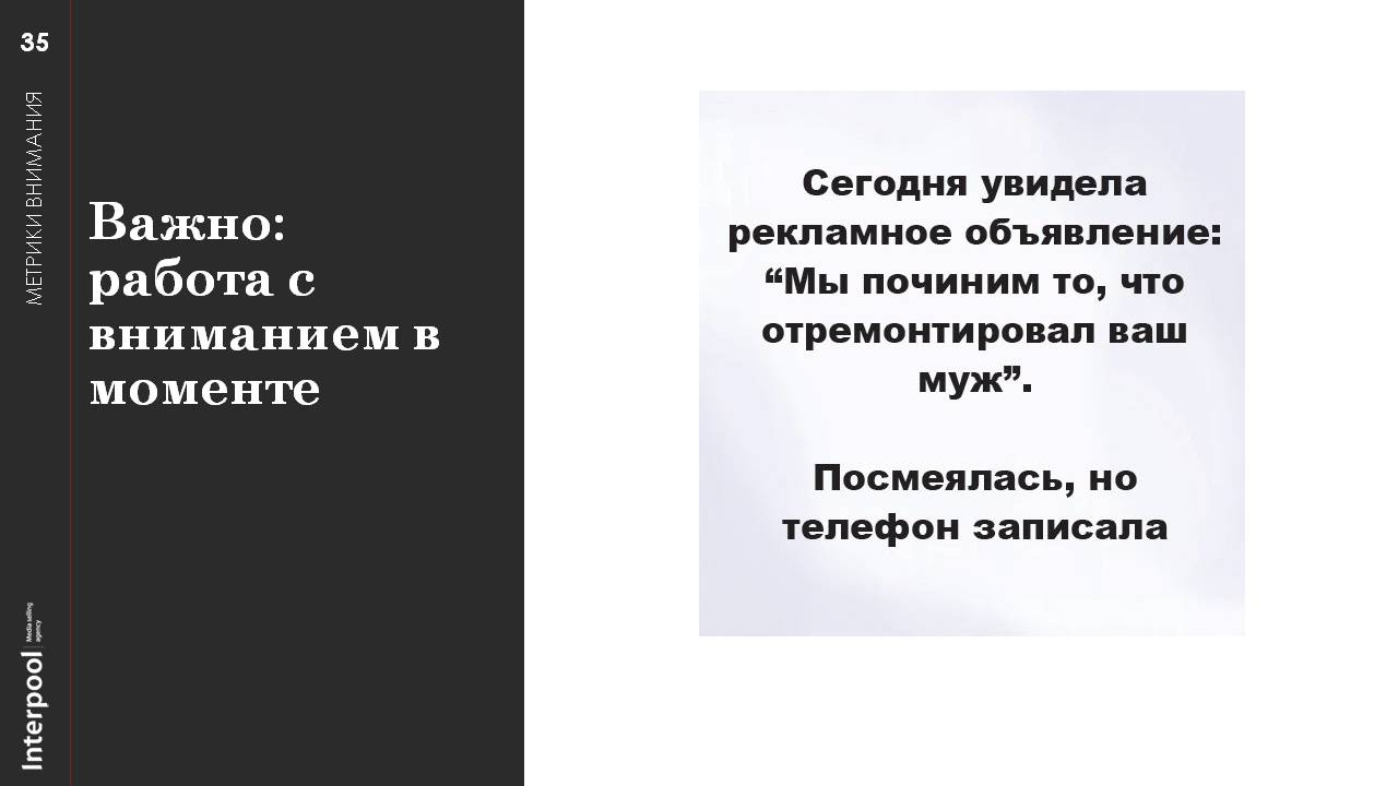 С 8 по 9 октября в Ереване прошла крупнейшая в России выездная конференция в области диджитал-маркетинга, которая ежегодно собирает вместе ключевых представителей рынка со стороны агентств, площадок и рекламодателей. Sostav традиционно делится презентациями делегатов. Рафаэль Мелик-Еганов, директор по развитию MSA Interpool, рассказал о внимании, медийной рекламе и восприятии информации в наше время.