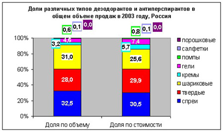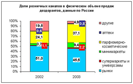 Розничные продажи дезодорантов в городах России с населением от 10 тысяч жителейРозничные продажи дезодорантов в городах России с населением от 10 тысяч жителей возросли в 2003 году по сравнению с 2002 годом на 13,5% в физическом выражении и на 22% - в денежном. Темп роста продаж снизился по сравнению с предыдущим годом, когда он составлял 25,5% по объему и возрос на треть по стоимости против 2001 года. Продажи мужских дезодорантов росли быстрее, чем женских: на 24% по объему и на 29% по стоимости против 9% и 16,6%, соответственно. Сегмент дезодорантов для мужчин занимает вдвое меньшую долю в продажах, чем женские дезодоранты. ![]() Продажи твердых дезодорантов показали хорошую динамику - в среднем около 20% за 2003 год. Продажи шариковых дезодорантов возросли в мужском сегменте на 34,5% по объему и на 45% по стоимости, в сегменте женских - на 6% и 12,7%, соответственно. В сегменте дезодорантов-спреев происходит удорожание: они увеличились на 23% по стоимости и только на 7% по объему. Рост продаж спреев для мужчин был несколько выше в физическом выражении - 15% против 2% в женском сегменте. ![]() Доля открытых рынков в продажах дезодорантов в физическом выражении сократилась с 51% в 2002 году до 45,5% в 2003, супермаркетов и минимаркетов - увеличилась с 4,8% до 11,6%: ![]() Лидеры рынка - компании Beiersdorf, Colgate-Palmolive, P&G, Scwarzkopf&Henkel и Unilever - занимали в 2003 году 80% рынка. |