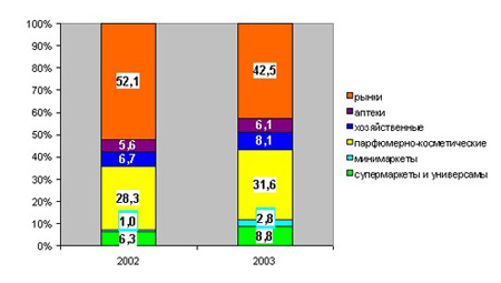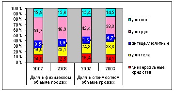 Средства по уходу за телом. Данные розничных продаж в 24 крупнейших городах РоссииВ 2003 году розничные продажи средств по уходу за телом в 24 городах России выросли по сравнению с 2002 годом на 13,6% в натуральном выражении и на 41% - в денежном. Самые быстрые темпы роста продаж наблюдались в сегменте антицеллюлитных средств, где продажи выросли более чем в 4 раза и по стоимости, и по объемам.Продажи других видов средств по уходу за телом выросли в денежном выражении более чем на 20%. В натуральном выражении продажи не росли в сегменте средств для рук (+5%) и универсальных средств (+1%). В сегментах средств для ног и тела (без учета антицеллюлитных средств) физический объем продаж увеличился на 12,6% и 37,7%, соответственно. Доли различных видов средств по уходу за телом в физическом и денежном объеме продаж в 24 городах в 2002-2003 гг. выглядели следующим образом: ![]() 10 компаний-лидеров по физическим объемам розничных продаж в 24 городах России в 2003 году (перечислены в алфавитном порядке):