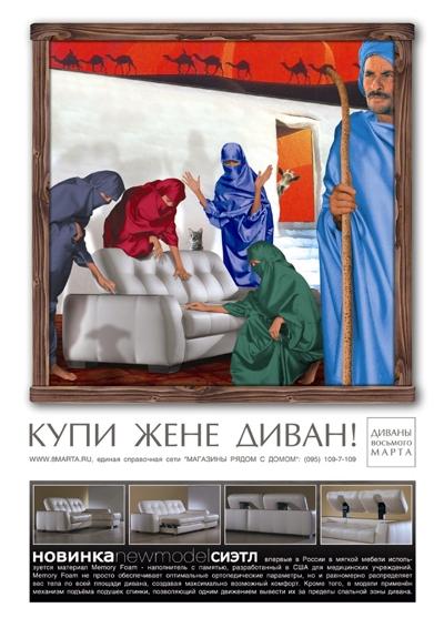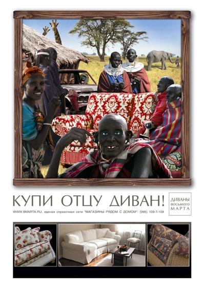 "Купи диван!"Мебельная фабрика "8 Марта", запомнившаяся многим рекламой "Диваны тут", проводит рекламную кампанию, в которую входит размещение наружной рекламы, постеров и стикеров. Директор рекламного отдела Фил Суземка, на вопрос редакции Sostav.ru о сроках проведения кампании, ответил: "Рекламная кампания началась, но срок ее окончания пока не установлен. Посмотрим на реакцию покупателей. Реклама "Диваны тут", например, работает уже четвертый год, хотя, признаться, такого эффекта никто от нее не ожидал. Так что, будет реклама работать - продолжим, нет - снимем. Мы стараемся действовать гибко, по ситуации". Дизайн макетов разработан дизайнерами рекламного отдела мебельной фабрики. ![]() ![]() ![]() ![]() |
