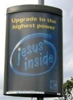 Появившийся на севере страны плакат приглашает прихожан на службу при помощи логотипа Intel, в котором слово "Intel" заменено на "jesus" (Иисус), и рекламным текстом "Апгрейд до высшей силы". Корпорация Intel подает на церковь в суд за незаконное использование своей торговой марки. Хотя, по мнению theregister.co.uk, некоторые владельцы компьютеров с логотипом "intel inside" испытывают необходимость в "апгрейде до высшей силы" и могут рассматривать этот слоган как земное обещание. |