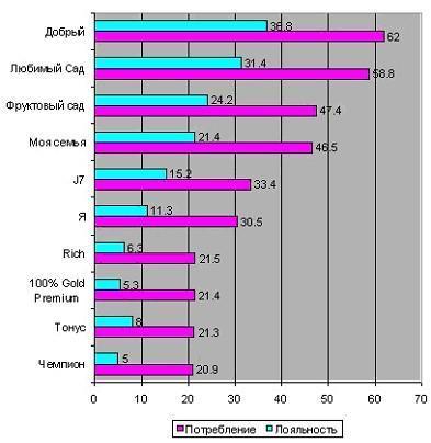 ![]() 29% потребителей соков в России пьют их несколько раз в неделю и чаще. А 27% всего несколько раз в месяц. Москвичи более активны в потреблении сока, т.к. несколько раз в неделю его пьют 39%. При этом безусловным лидером вкуса в России является яблочный сок - его предпочитают 51% потребителей. Второе место занимает апельсиновый, а третье - персиковый. Вкусовые пристрастия среди москвичей и россиян несколько отличаются. В Москве на первом месте по предпочтению потребителей стоит апельсиновый сок (54%), на втором - яблочный (52%), на третьем - томатный (42%). При этом, подавляющее большинство потребителей данного напитка среди россиян (62%), пьет сок "Добрый", а 59% - "Любимый сад". Далее следуют марки: "Фруктовый сад" (47%) и "Моя Семья" (46%). Москвичи также отдают предпочтение соку "Добрый", его пьют 60%. На втором месте находится марка "J7" (54%), далее следуют "Любимый сад" (53%), "Фруктовый сад" (43%) и "Моя семья" (41%). Данные по потреблению и лояльности* других пивных марок приведены в таблице ниже: