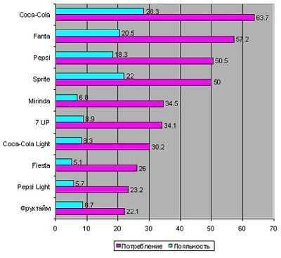 График 4: Потребление и лояльность к маркам прохладительных напитков, ТОП-10 (процент от потребителей, Россия)