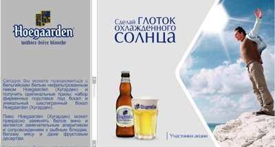 Victory S.A. участвует в промо-акции пива HoegaardenВ течение месяца в ведущих ресторанах Москвы проходит промо-акция Бельгийского белого нефильтрованого пива Hoegaarden (Хугарден): "Сделай глоток охлажденного солнца". Предлагается попробовать пиво Hoegaarden и получить оригинальные призы - наборы фирменных подставок и шестигранные бокалы Hoegaarden. На интернет-ресурсах, посвященных ресторанной тематике, таких как Afisha.ru, Menu.ru, InOut.ru, Restoran.ru, проходит рекламная кампания в поддержку акции. Специально для рекламной кампании была разработана промо-страница http://hoegaarden.victory-sa.com/. Медиапланирование и размещение Victory S.A. ![]() |