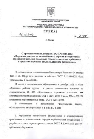 Действие ГОСТ Р 52044-2003 о размещении средств наружной рекламы приостановленоНовая редакция этого ГОСТа будет разрабатываться с учетом мнения специалистов и обсуждаться публично Федеральное Агентство по техническому регулированию и метрологии, входящее в Министерство промышленности и энергетики РФ издало приказ "О приостановлении действия ГОСТ Р 52044-2003 "Наружная реклама на автомобильных дорогах и территориях городских и сельских поселений. Общие технические требования к средствам наружной рекламы. Правила размещения". ТЕКСТ ПРИКАЗА В соответствии с постановлением Госстандарта России от 24 декабря 2003г. №381-ст дата введения в действие ГОСТ Р 52044-2003 была установлена с 1 июля 2004г. в связи с поступавшими обращениями в декабре 2004г. была образована рабочая группа в рамках технического комитета по стандартизации №278 "Безопасность дорожного движения" для подготовки изменения ГОСТ Р 52044-2003. В июне 2004г. ТК 278 представлен пересмотренный текст ГОСТ Р 52044-2003. В соответствии с положениями Федерального закона "О техническом регулировании" приказываю: 1. Управлению технического регулирования и стандартизации организовать в установленном порядке опубликование уведомления о разработке проекта пересмотренного текста ГОСТ Р 52044-2003 для его публичного обсуждения. 2. Приостановить действие ГОСТ Р 52044-2003 до утверждения и введения в действие пересмотренной редакции текста указанного национального стандарта. Подпись: Руководитель Федерального агентства по техническому регулированию и метрологии. Источник: ФАТРиМ ![]() ![]() Новости наружной рекламы |