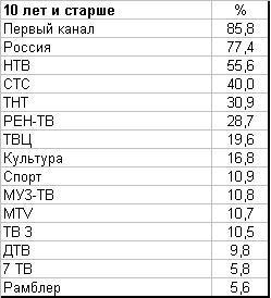 ![]() Недельные аудитории и доли национальных каналов по России - 1 квартал 2004Недельные аудитории телеканалов. Россия, города с населением 100 тыс. чел. и более. ![]() Источник: R-TGI (Российский Индекс Целевых Групп) Недельная аудитория канала - количество человек обычно смотрящих данный телеканал хотя бы один раз в неделю. Объем аудиторий представлен в процентах от городского (100+) населения России старше 10 лет. Карта половозрастных характеристик аудиторий канала ![]() |