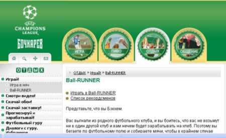 Правило трех "Б": Бочкарев спасет Бэкхема от БутсыПортал о футболе "Лига Чемпионов УЕФА - Бочкарев" отмечает начало нового сезона Большой Игры УЕФА запуском новой flash-игры Ball-RUNNER Портал был создан интернет-агентством "ЮМИ Студия" с целью осуществления информационной и рекламной поддержки в интернете партнерства бренда Бочкарев и Лиги Чемпионов УЕФА. Что касается новой игры Ball-RUNNER, то ее основной задачей является повышение потока посетителей портала в связи с началом нового сезона УЕФА. Эта игра - гипотеза о том, чем занимались игроки и тренеры в межсезонье. Лучшие игроки будут увековечены в Зале Славы портала. ![]() |