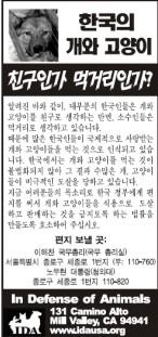 Группа "В защиту животных" (In Defense of Animals) разместила в издании Korean Journal призыв к корейцам и американцеам корейского происхождения выступить против незаконного убийства кошек и собак в Корее. В объявлении приведена фотография собаки в клетке, сделанная на рынке Моран в Сеуле, и просьба к правительству Корее принять закон, который запрещал бы продажу и убой собак с тем, чтобы использовать их мясо в пищу. Корейское правительство пока игнорирует неподтвержденные факты жестокого убийства животных, таких как повешение и умерщвление электричеством. Мясники утверждают, что последняя минута мучений способствует выбросу адреналина, а это сказывается на качестве мяса.