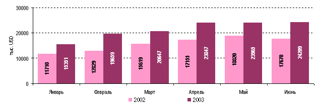 Диаграмма 3 - Динамика изменений рекламных бюджетов на телевидении, I полугодие 2003, 2004гг.(Открывается в новом окне) ПРИМЕЧАНИЕ. При расчете бюджетов использованы официальные прайс-листы без учета скидок, надбавок. Рекламные бюджеты на ТВ рассчитаны по ожидаемой длительности рекламных роликов. Не учтены рекламные расходы на кабельных телеканалах, представляемых компанией "Алма ТВ".