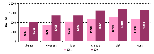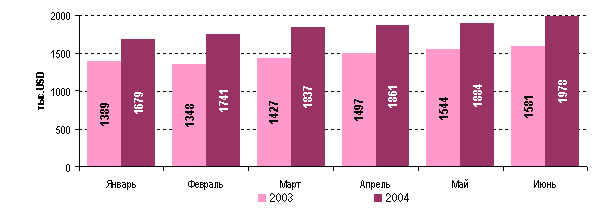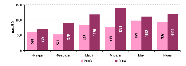 В период с января по июнь 2004 года наблюдается рост рекламных расходов на размещение роликов на телевидении. Наиболее заметен рост рекламных бюджетов в феврале - на 59,7%.