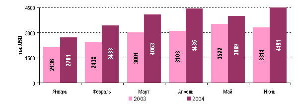 В период с января по июнь 2004 года рекламные расходы на размещение рекламных конструкций по г. Алматы стабильно растут.